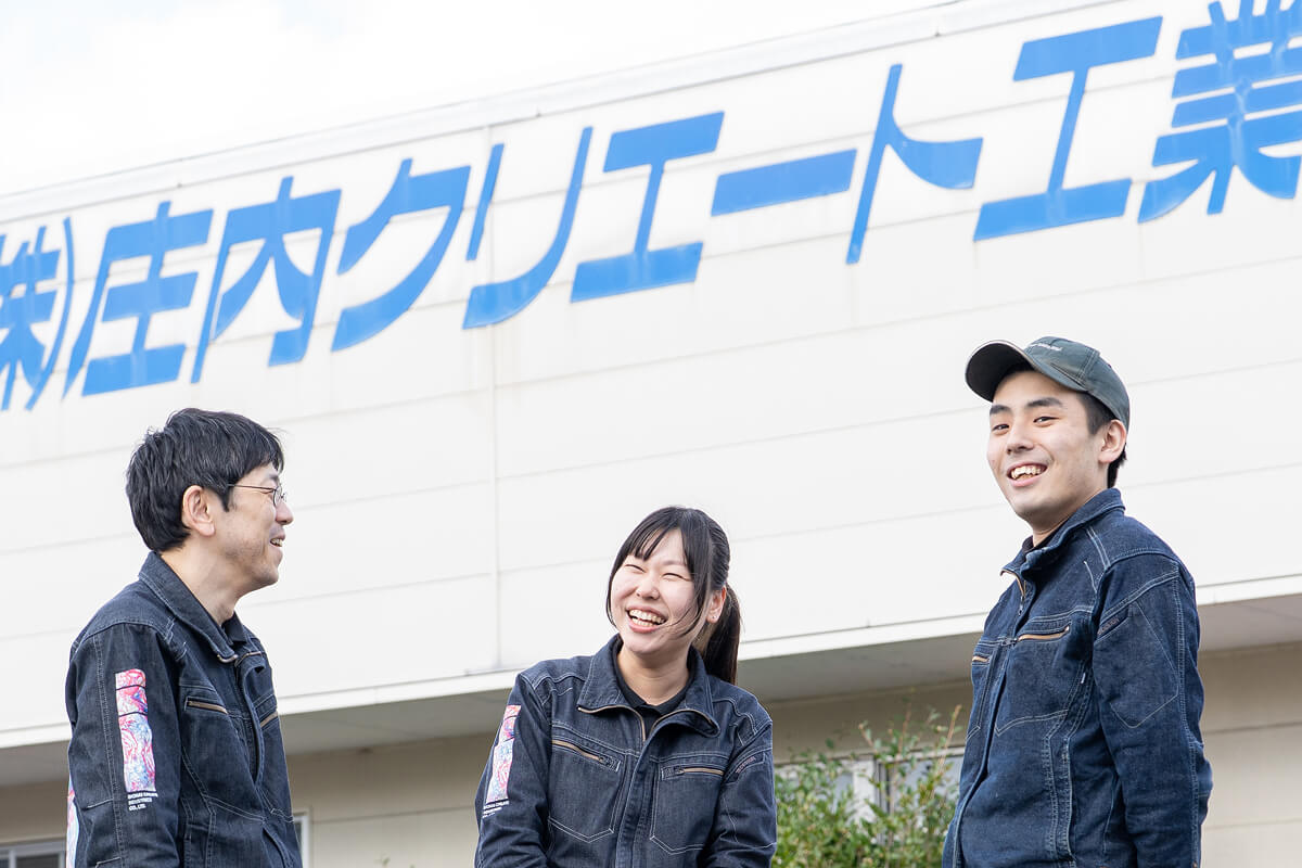 「CREATE FOR SMILES:笑顔を繋ぐ仕組みをつくる」の企業スローガンに基づき、「庄内クリエート工業メンバー自身の笑顔」と「もの創りを通じて生み出すお客様の笑顔」さらに、「直接・間接的にもの創りや企業活動を通じて関わる人々を少しずつでも笑顔に、そして少しずつでもその輪を大きくしていく。