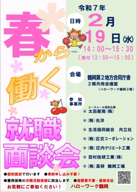 当社は、令和7年2月19日(水)にハローワーク鶴岡にて開催される『春から働く』就職面談会に参加することとなりました。