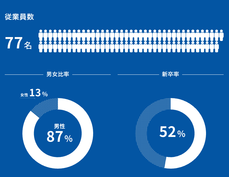 男女比率・年齢構成から新卒率、職種別割合まで、実際の数字を公開して「どんな人たちが働く職場なのか」をイメージしやすくしています。