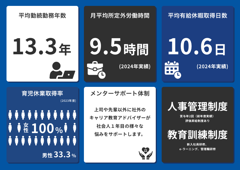 平均継続勤務年数や月平均所定外労働時間、平均有給休暇取得日数、育児休業取得率など、直近の実績データもオープンにしています。