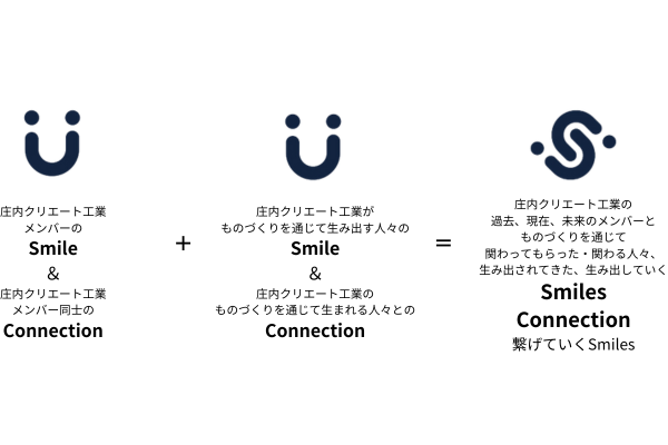 このロゴは、当社のスローガン「Create for Smiles」に基づいており、「庄内クリエート工業のメンバー自身の笑顔」と「モノづくりを通じてお客様にもたらす笑顔」を融合させています。
