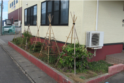 毎年冬を迎える前に、従業員の手で木に雪囲いを行っています。