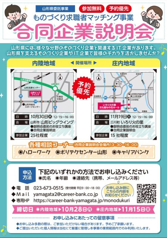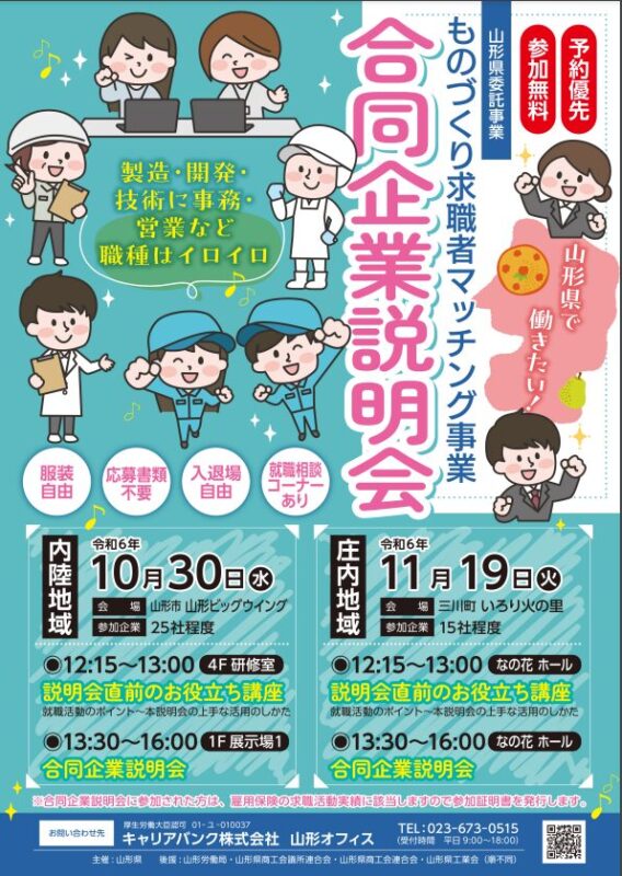 | 予約申し込み方法(参加の際は予約が必要です) | 予約方法は3種類あります。いずれかの方法で予約申し込みをお願いします。 ①電 話 023-673-0515(担当がお伺いいたします) ②メール yamagata2@career-bank.co.jp(下記項目を記入し送信してください) 予約申し込みの際の確認事項 1.氏名 2.年齢 3.性別 4.居住市町村 5.連絡先 ⓷ホームページ お申し込みURLはこちらをクリック |