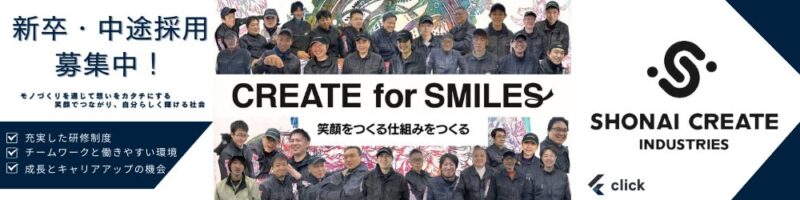 庄内クリエート工業では設計から組立までの一貫したモノづくりでお客様・家族・仲間・自分自身を笑顔にしていくため「社会を知る、会社を知る、仲間を知る、技術を高める」ための教育やサポートに力を入れていきます。